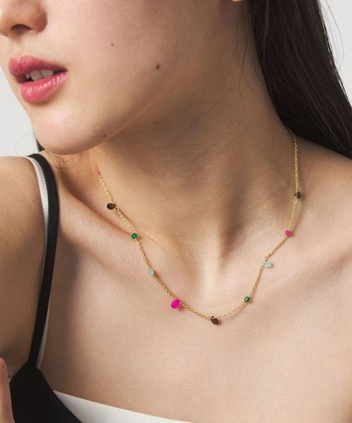 華奢なチェーンで女性らしく、カラー石がコーディネートのアクセントになっています。