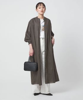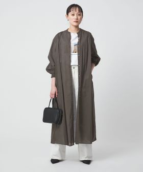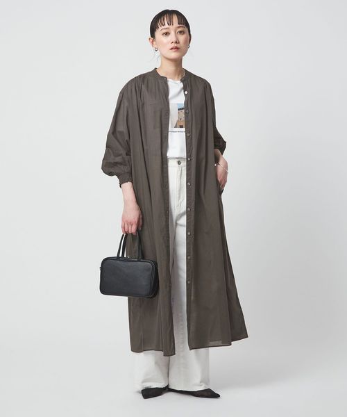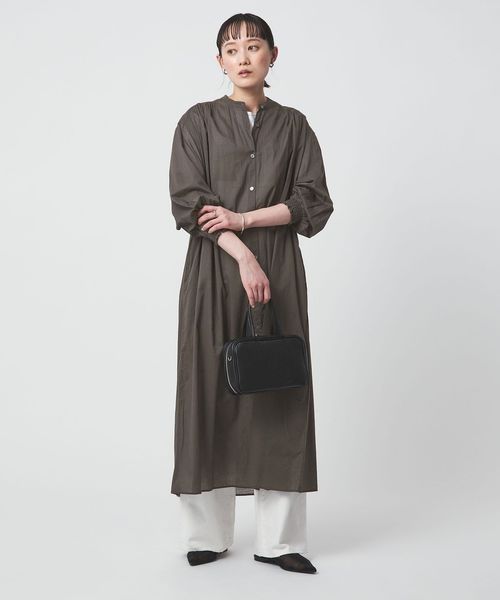 首まわりはすっきりとしたバンドカラーで、上品な抜け感を演出。