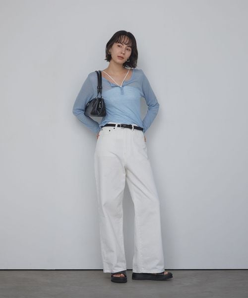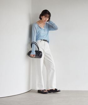 胸元のバランスに鮮度が出る、ジャケットやカーデなどの羽織りアイテムに合わせるのがおすすめ。