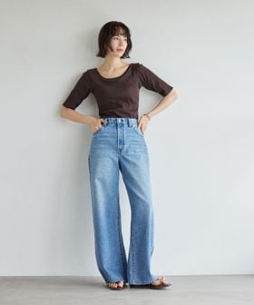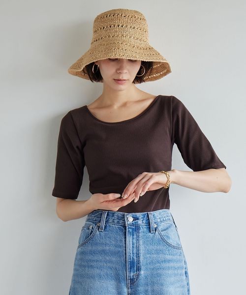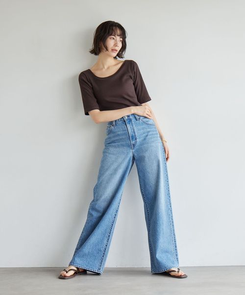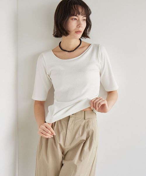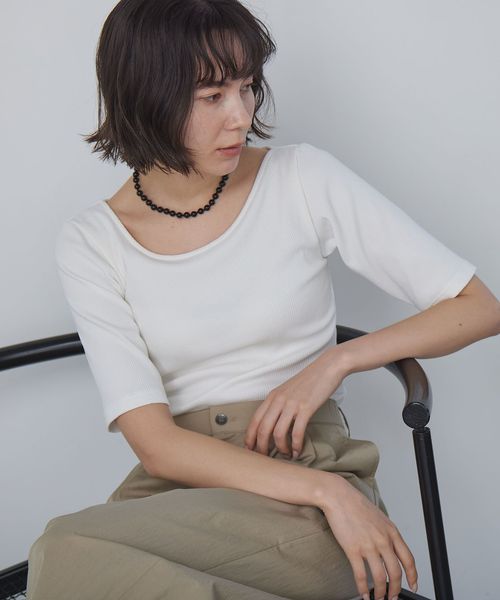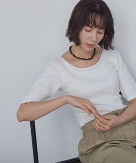 すっきりとしたネックラインなので、アクセサリーをプラスするのも◎