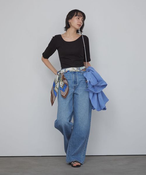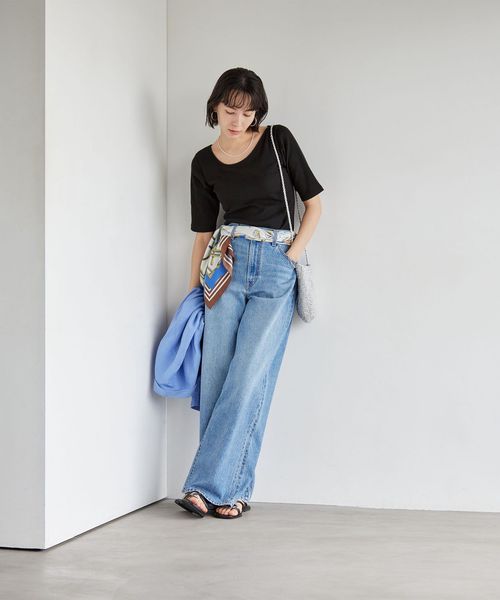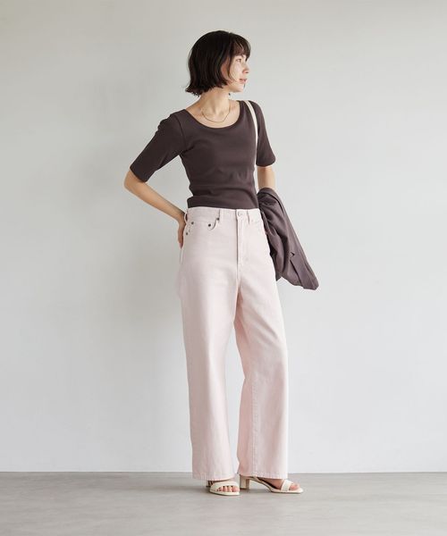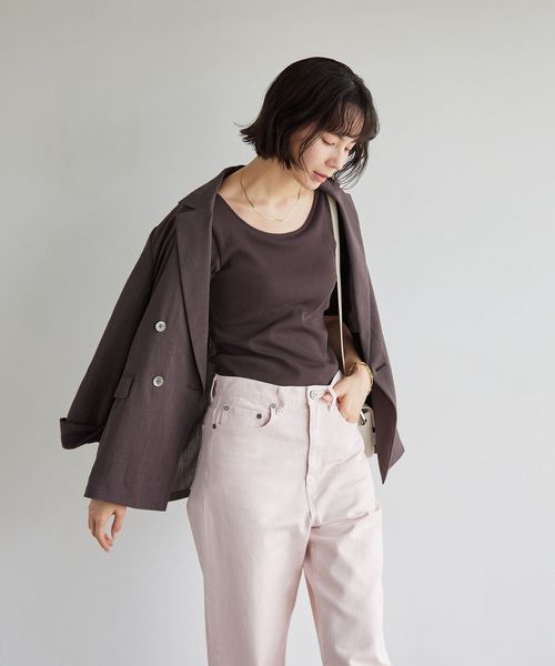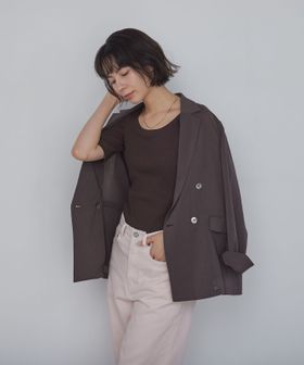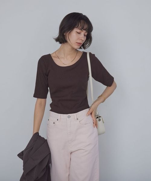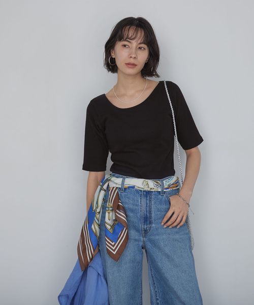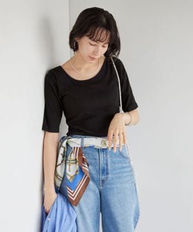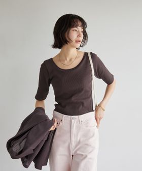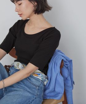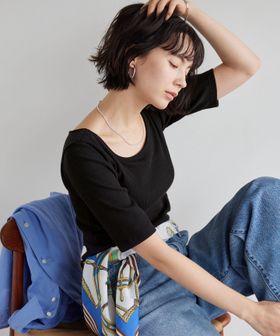 すっきりとしたネックラインなので、アクセサリーをプラスするのも◎