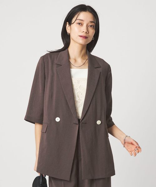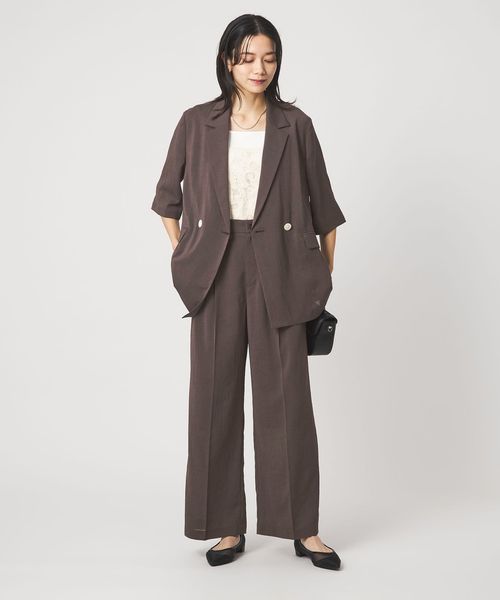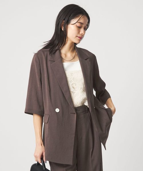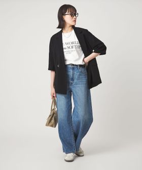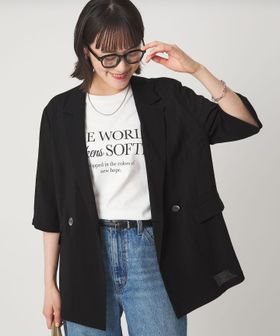 マニッシュなダブルジャケットを2ボタン仕様で、軽やかさと今っぽい表情をプラス。