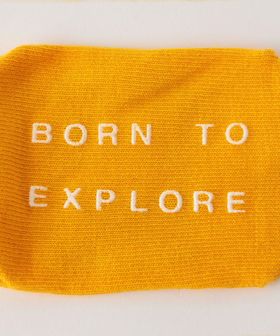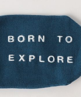 足裏には「BORN TO EXPLORE」の文字をラバープリントしたすべり止めを配置し、 履き口の裏に記名スペースを確保しています。