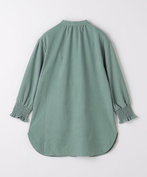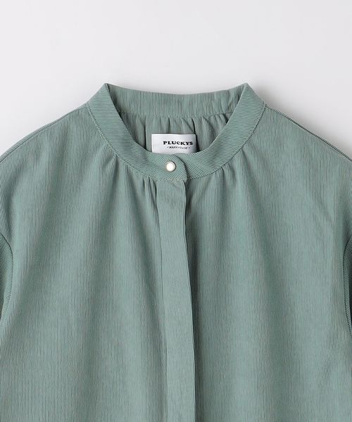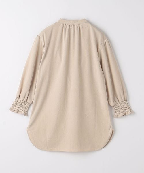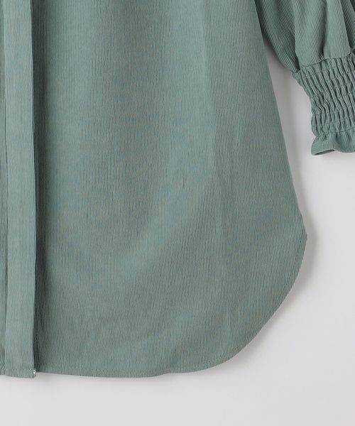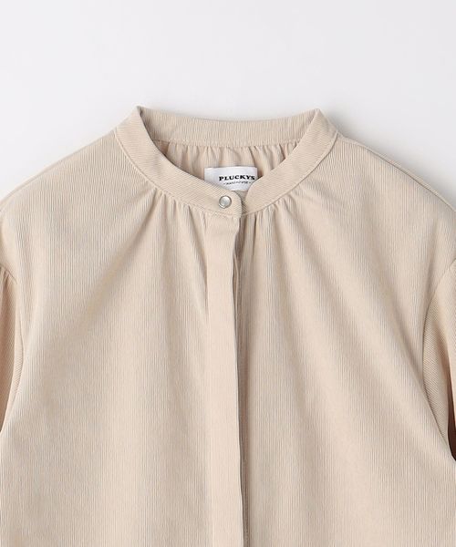 ノーカラーですっきりとした首回りに、袖のシャーリングデザインを際立たせたデザインにしています。