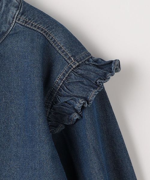 肩にほどこしたラッフルフリルとベルタイプの袖口がポイントのワンピース。