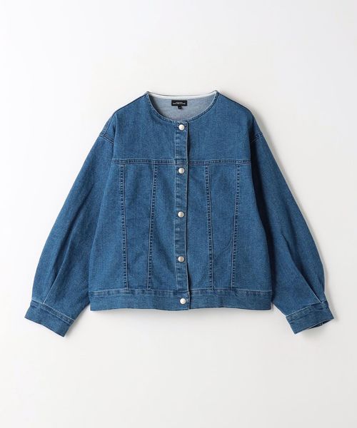 ノーカラーのデニムジャケット。