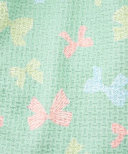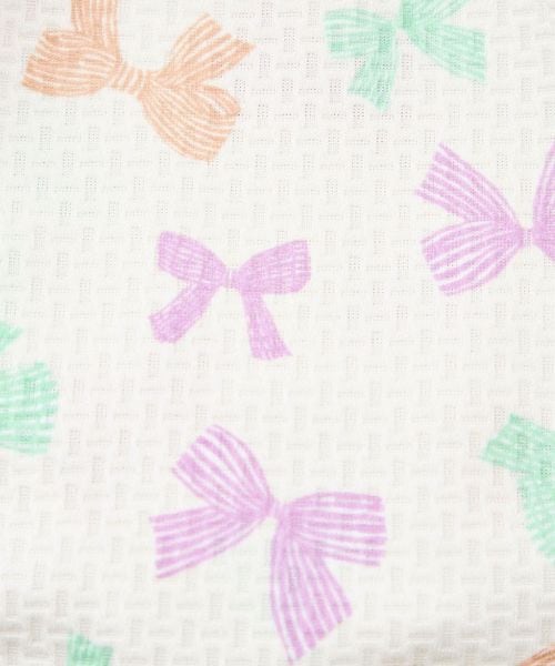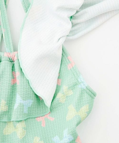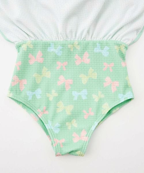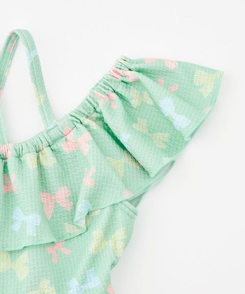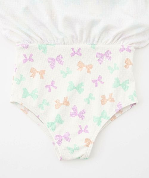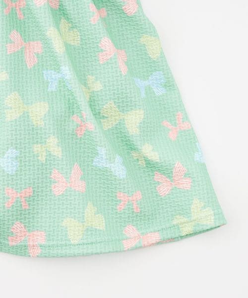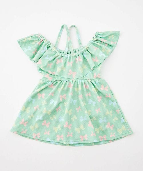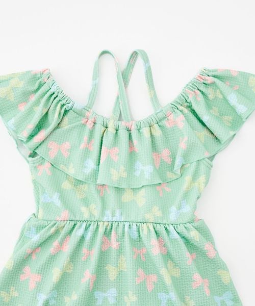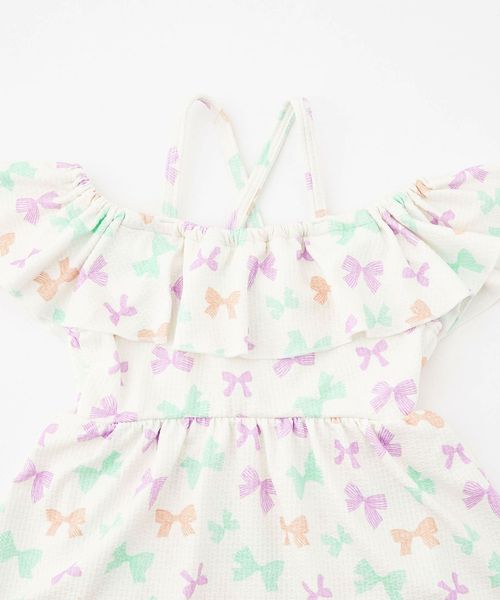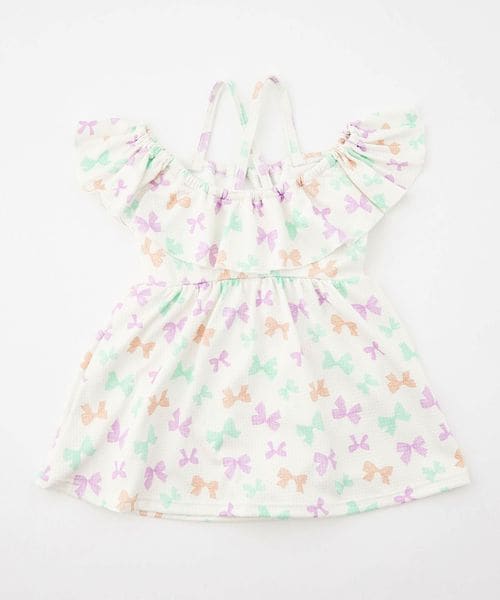 背中でクロスしたストラップにフレアスカート、手書き風の可愛らしいリボンをマルチカラーにした、女の子らしさをぎゅっと詰め込んだデザインです。