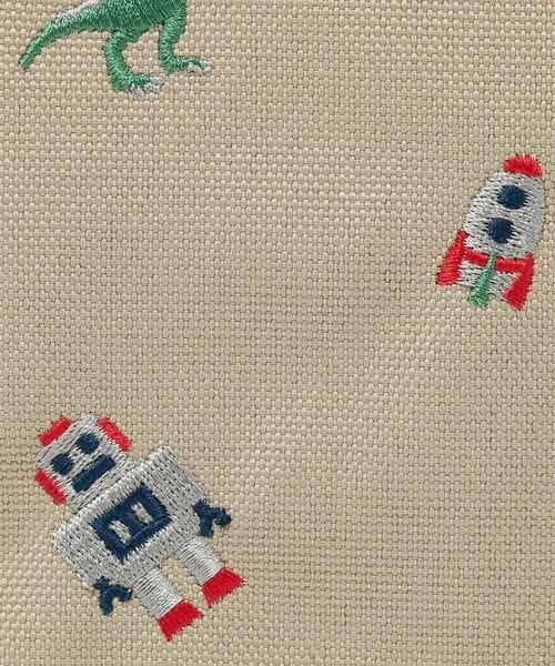 ベージュをベースに、ロボット&ロケット&恐竜のおもちゃをイメージした刺しゅうを施しました。