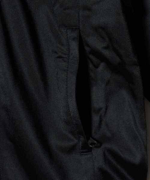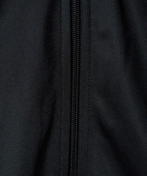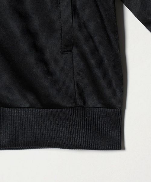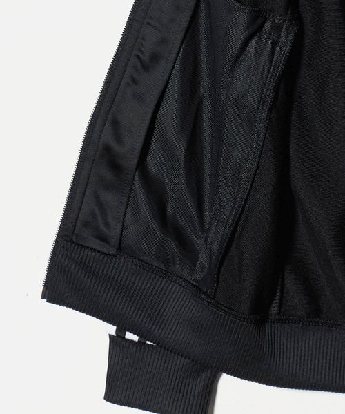 地色とくっきりとしたコントラストを成す白でスリーストライプスとトレフォイルロゴ、ボンバー襟とフルジップというディテールでまとめています。