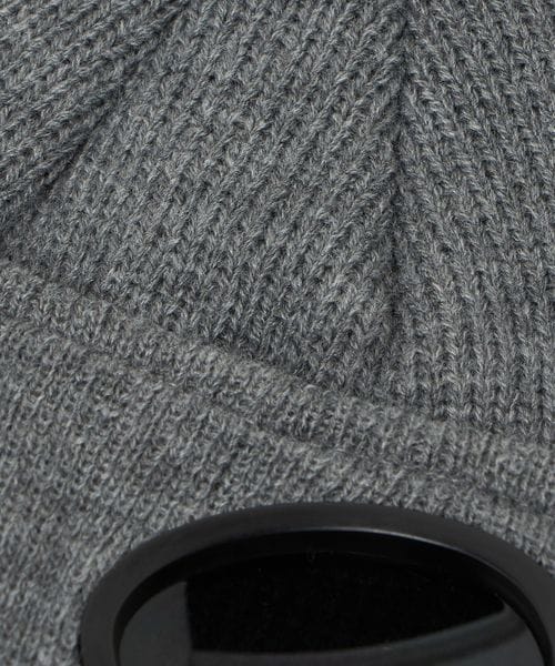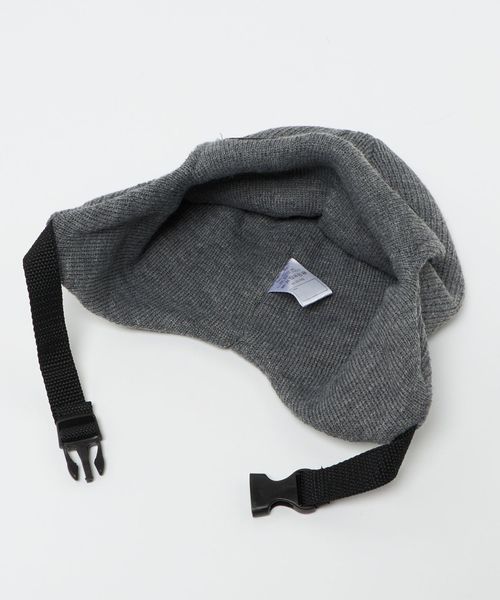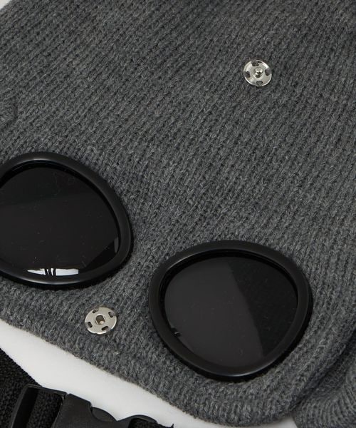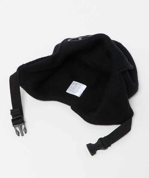 ツバをおろして着用するとなんとゴーグルになるバックル付きニットキャップ。