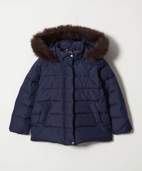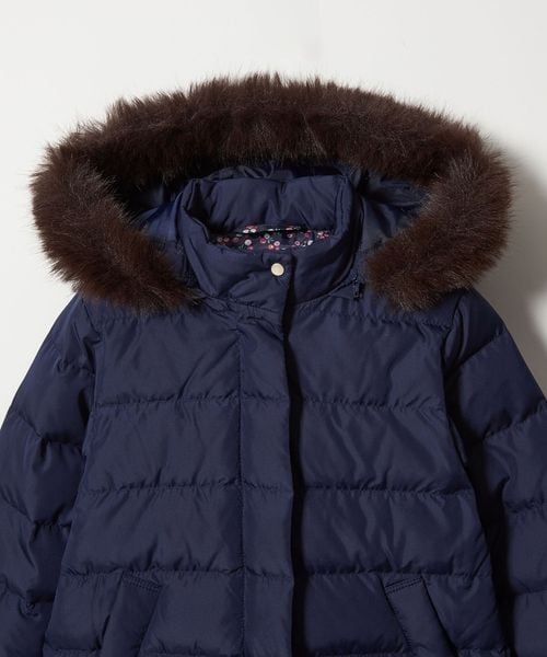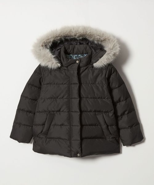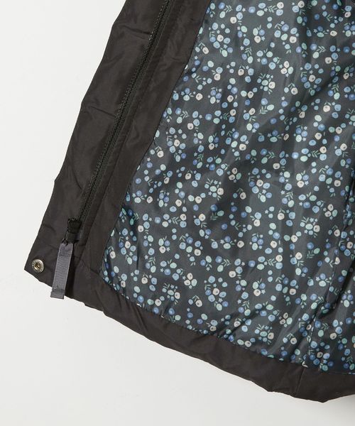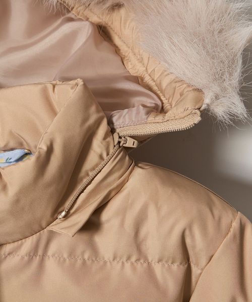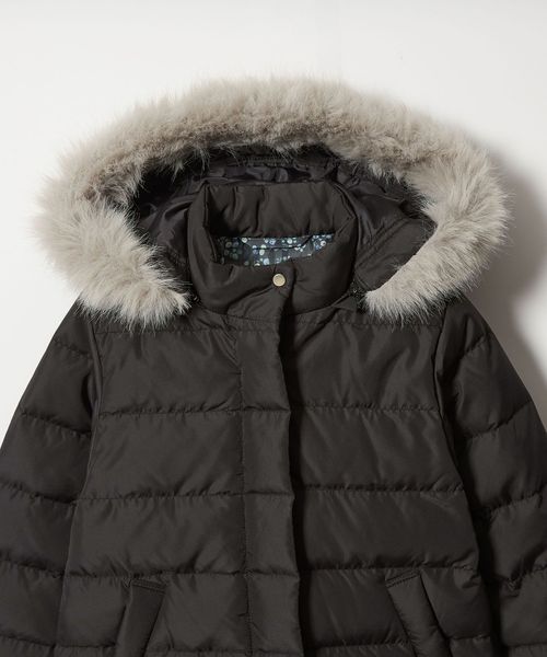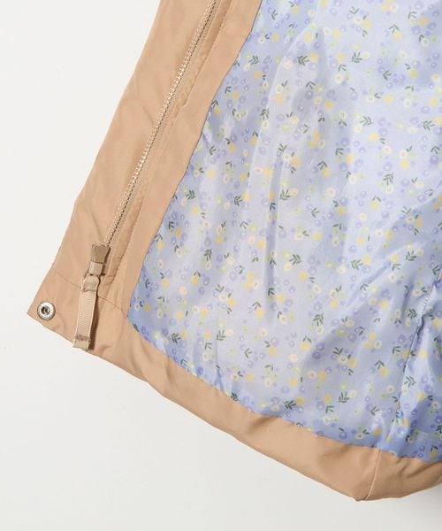 さりげなくのぞく花柄の裏地、フードにはフワフワのフェイクファーをあしらった、女の子らしさをぎゅっと詰め込んだ一枚。