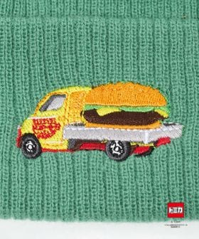 カラーが目を惹くリブニットキャップに トヨタクラウンパトロールカー、日立建機リジットダンプトラック、トヨタタウンエースハンバーガーカー、トヨタダイナ清掃車を刺繍しました。