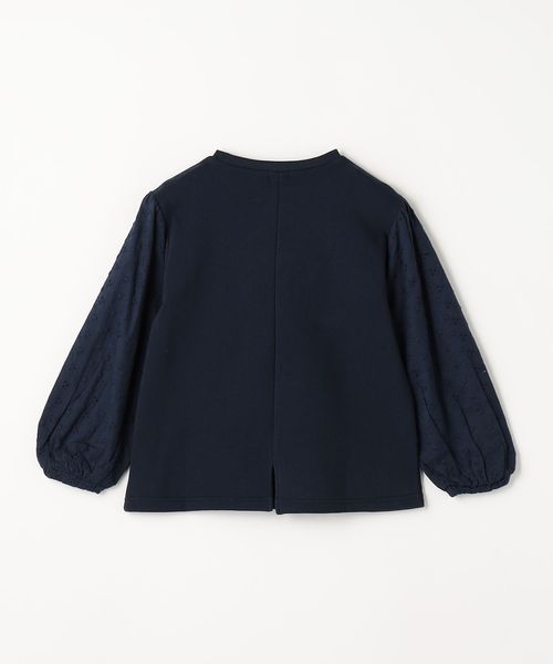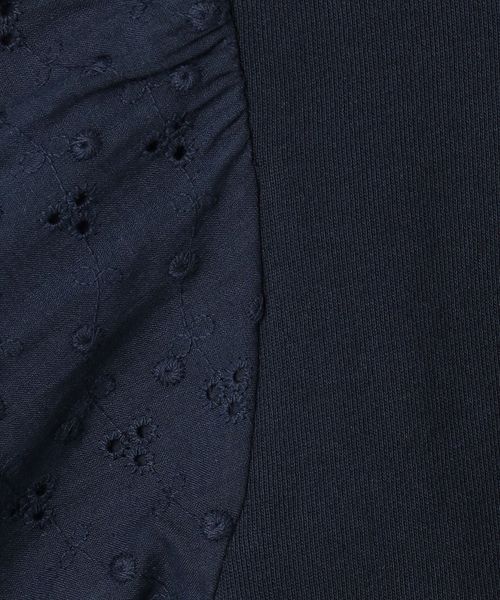 裏毛素材をメインに、袖は花柄刺繍の布帛素材で切り替えたプルオーバー。
