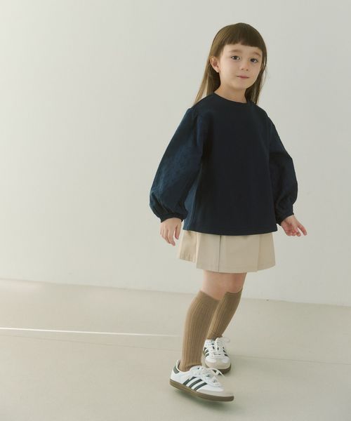 裏毛素材をメインに、袖は花柄刺繍の布帛素材で切り替えたプルオーバー。