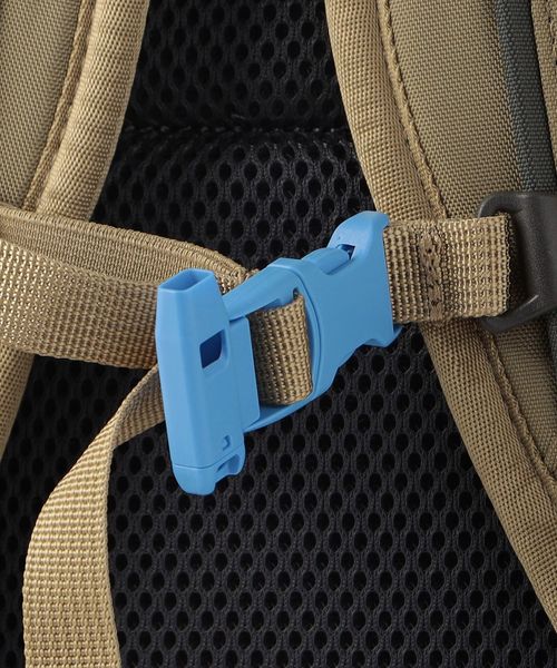 安全性を考慮し、一定の荷重で自動開放するチェストストラップ付き。