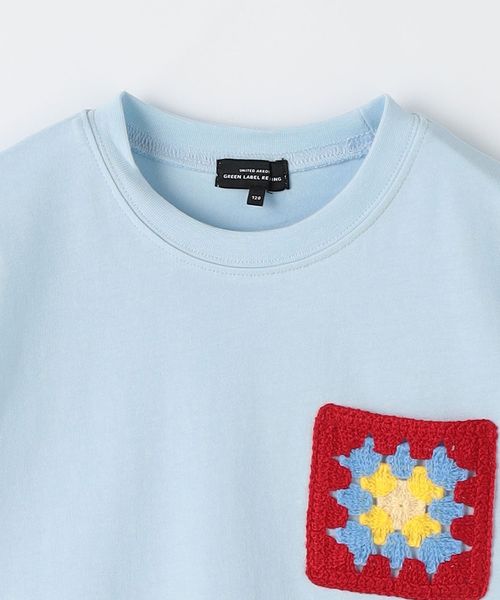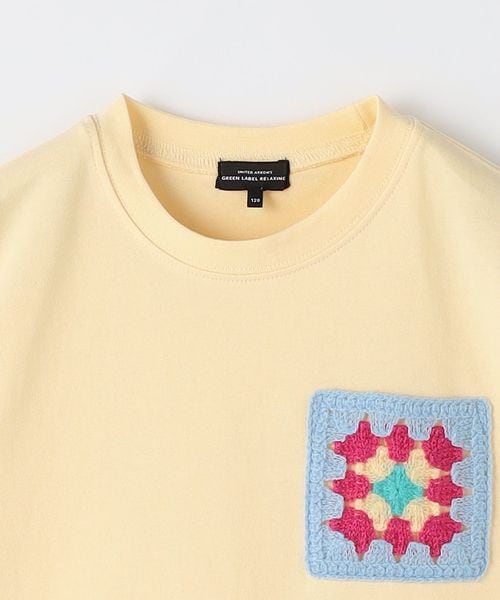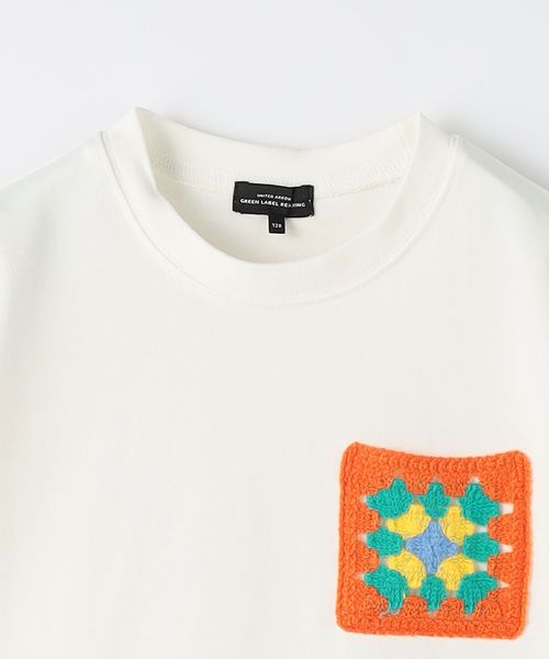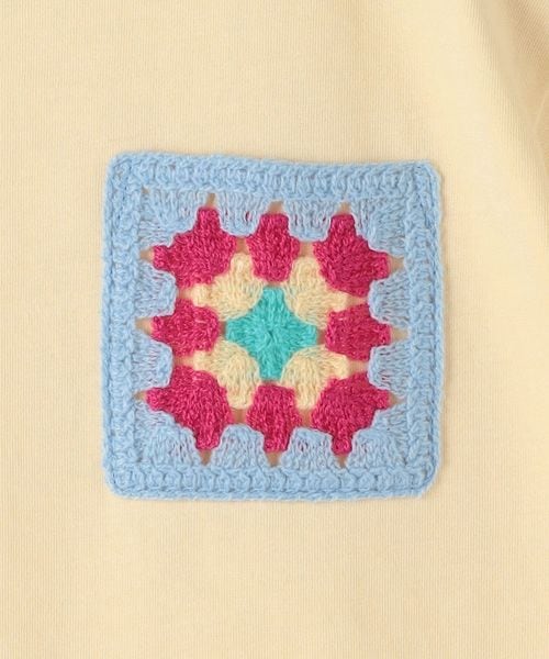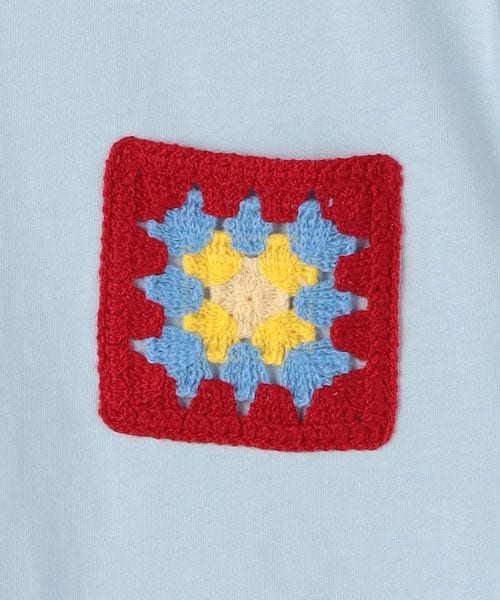 色鮮やかなカギ針のニットポケットが目を引くデザイン。