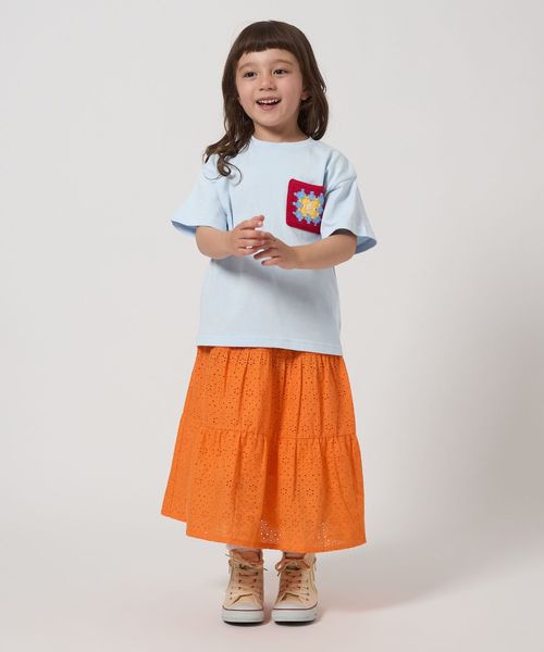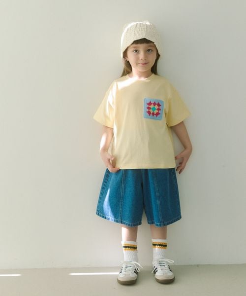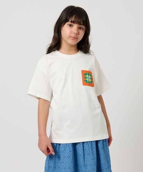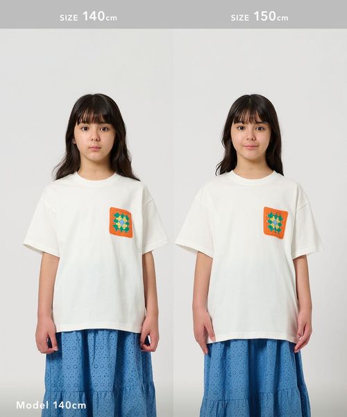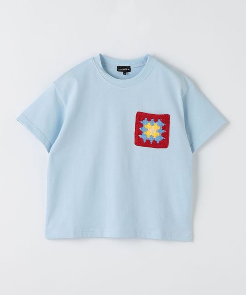 色鮮やかなカギ針のニットポケットが目を引くデザイン。