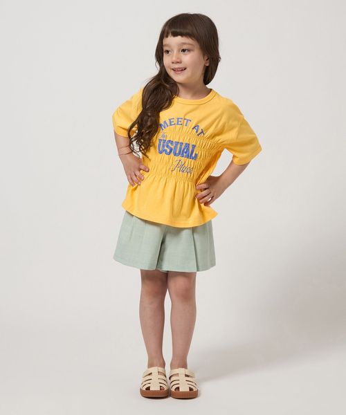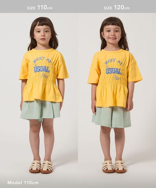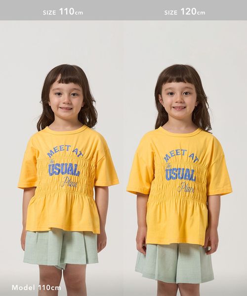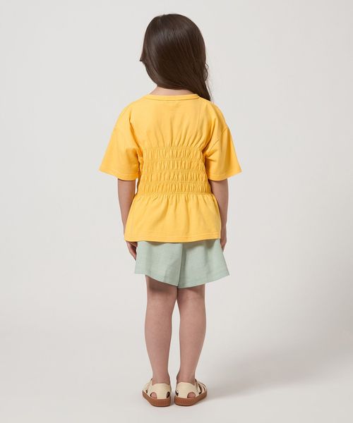 大人トレンドでもある、身頃にシャーリングのアレンジをしたTシャツ。