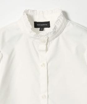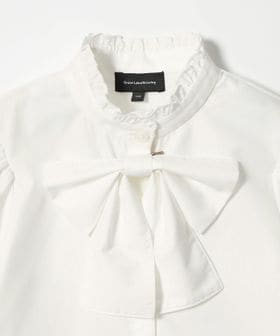 フリルの付いたスタンドネックと取り外し可能な大きめのリボンがかわいい布帛生地のブラウス。
