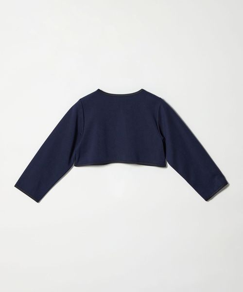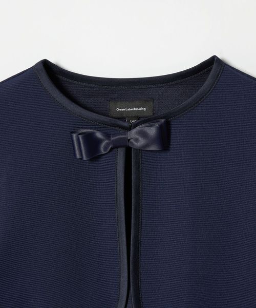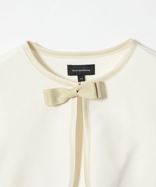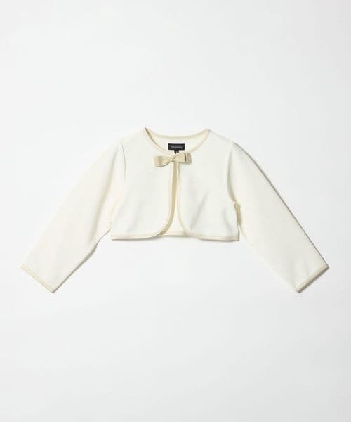 上品なパイピングを施したシンプルなフロント、取り外し可能なリボンのクリップがワンポイントになったボレロ。
