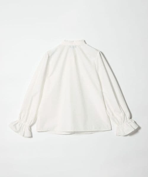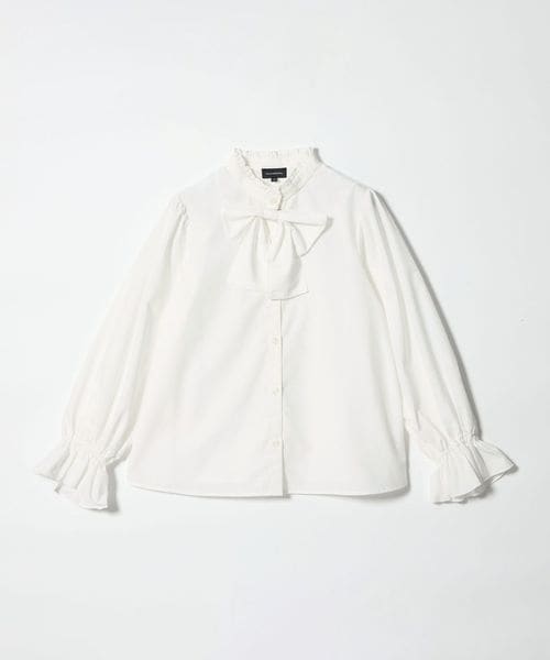 フリルの付いたスタンドネックと取り外し可能な大きめのリボンがかわいい布帛生地のブラウス。