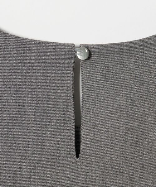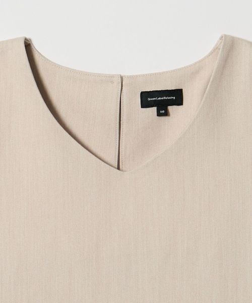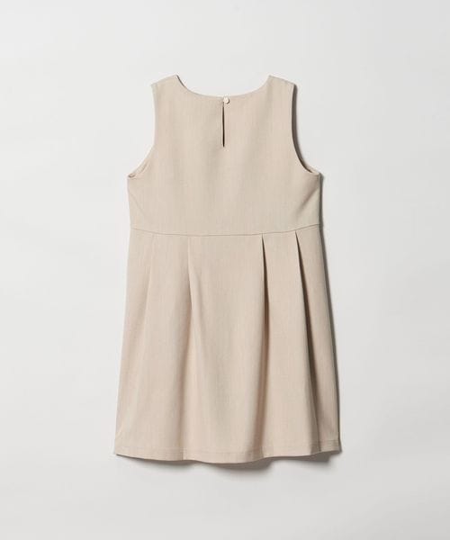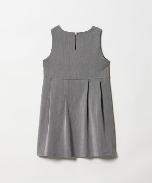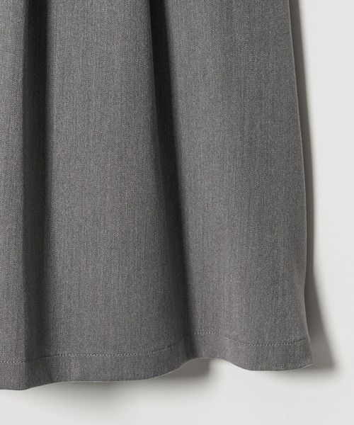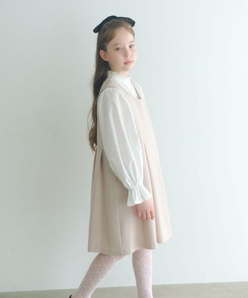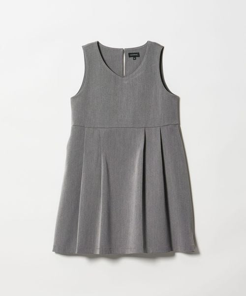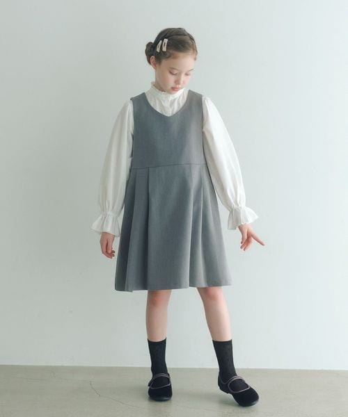 ジャンパースカートも高め位置の切り替えに、顔周りをすっきりとみせてくれるVネックで合わせるインナーによって違った雰囲気を楽しめます。