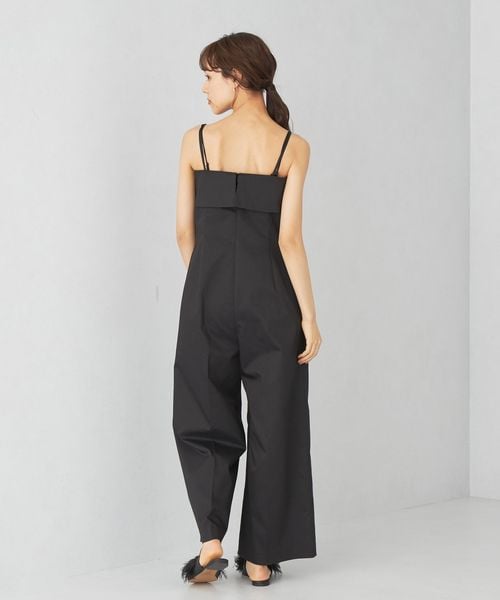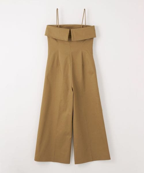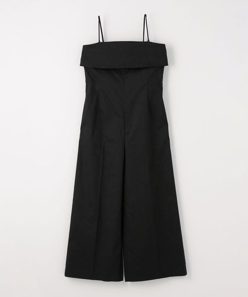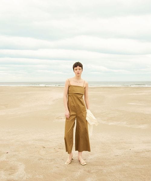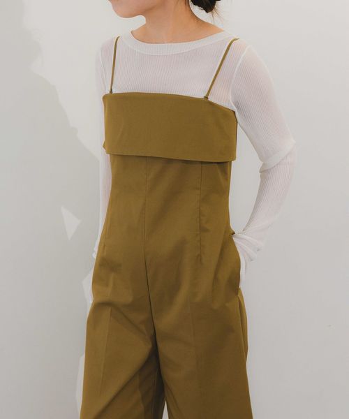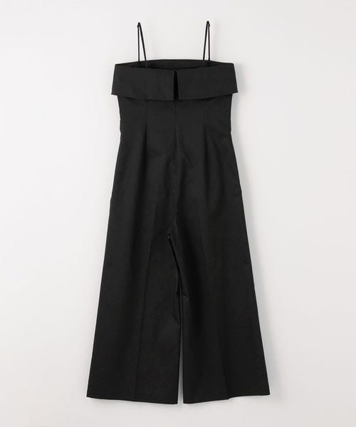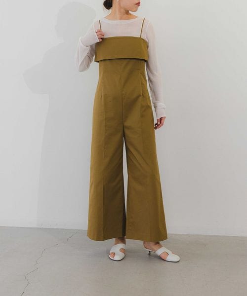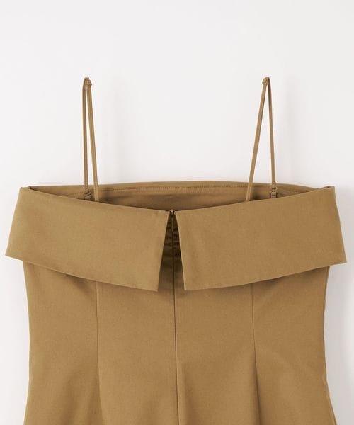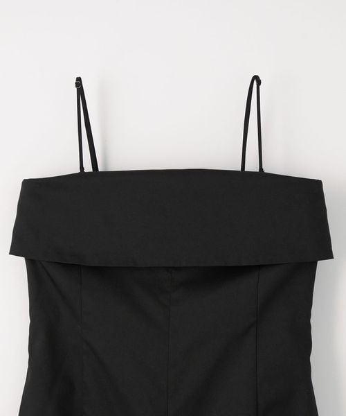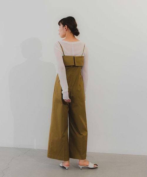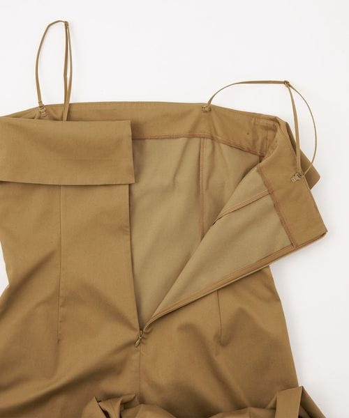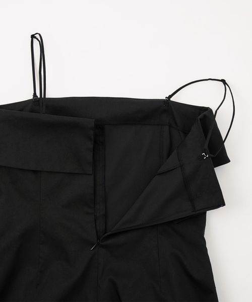 モードな印象のキャミサロペット。肩ひもは取り外しが可能で、ベアの折り返し部分をめくるとサイズ調節用のボタンがついていて、肩紐を外してベアトップシルエットでも着用出来ます。