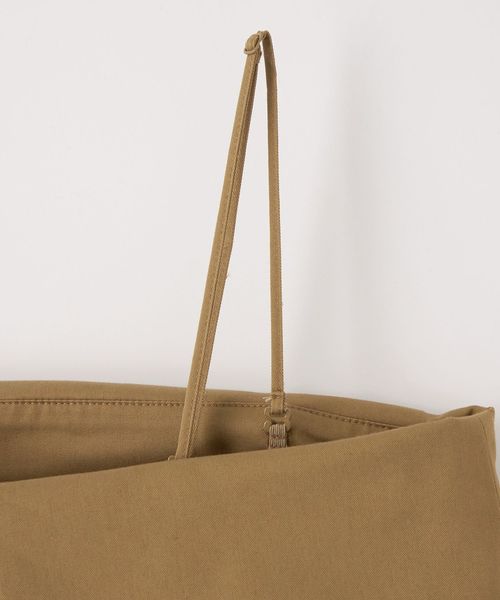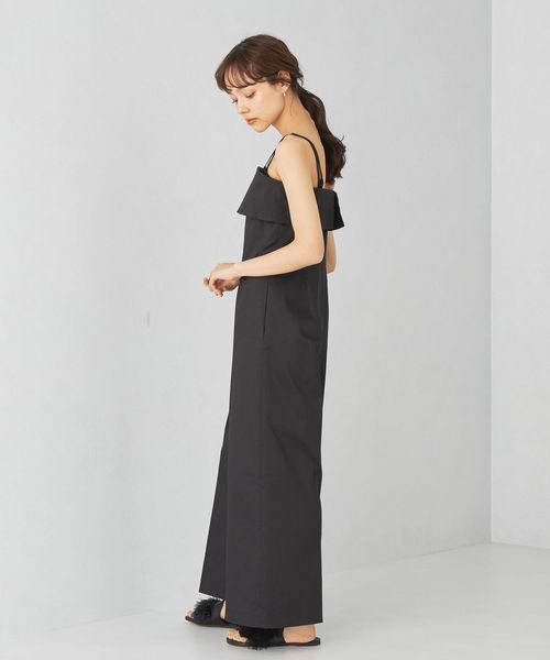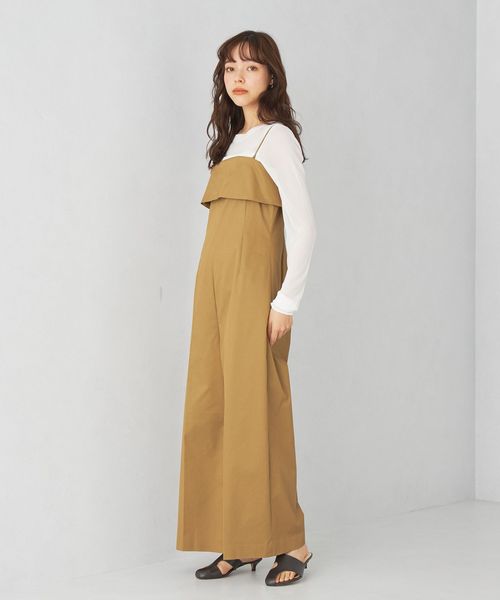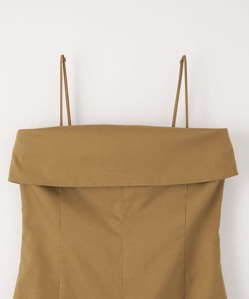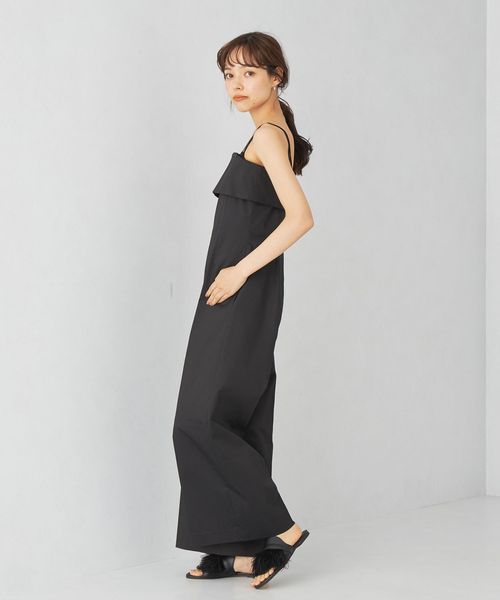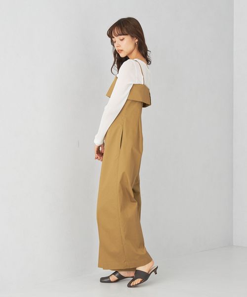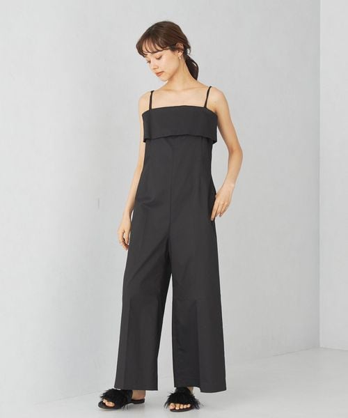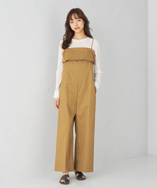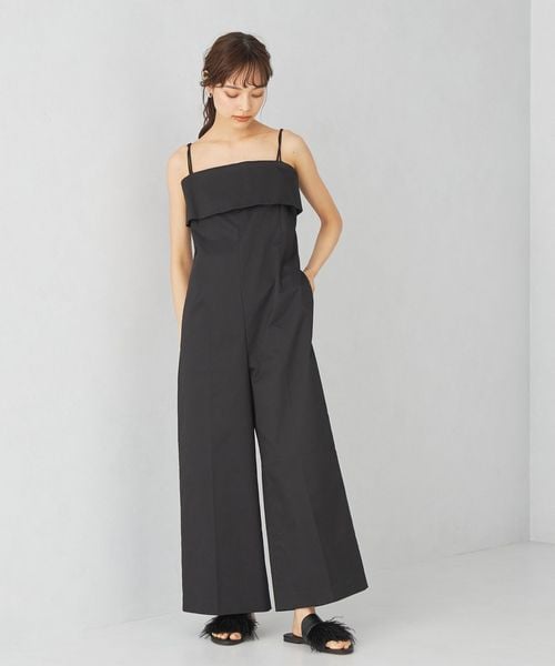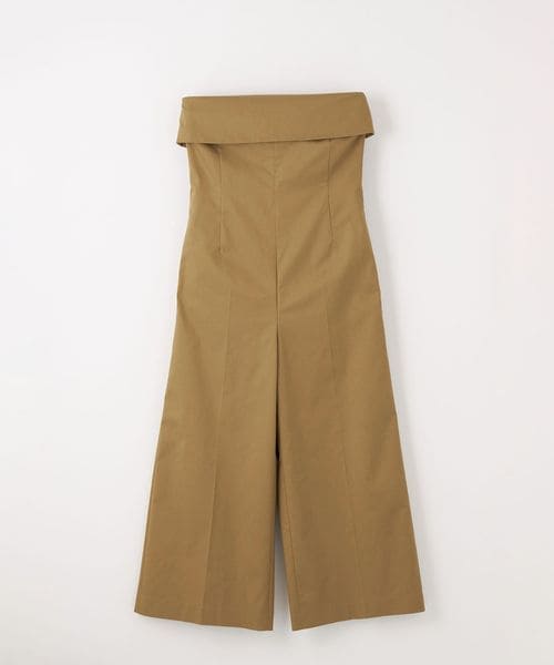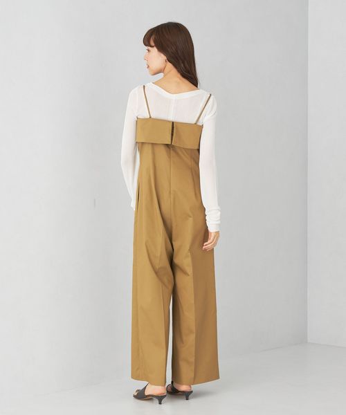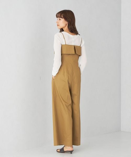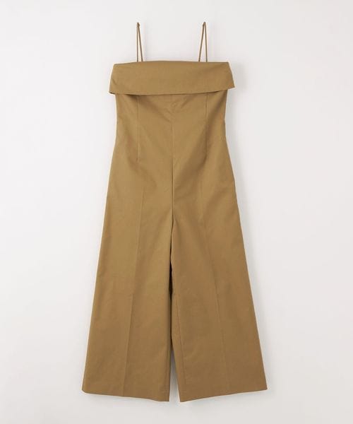 モードな印象のキャミサロペット。肩ひもは取り外しが可能で、ベアの折り返し部分をめくるとサイズ調節用のボタンがついていて、肩紐を外してベアトップシルエットでも着用出来ます。