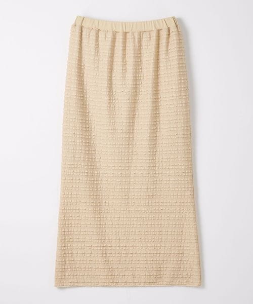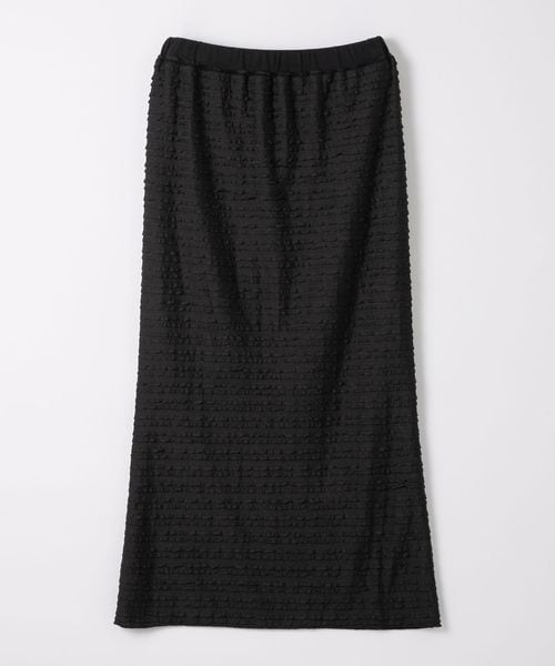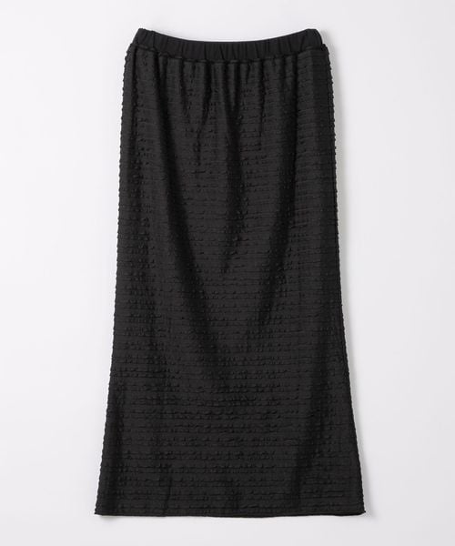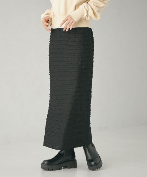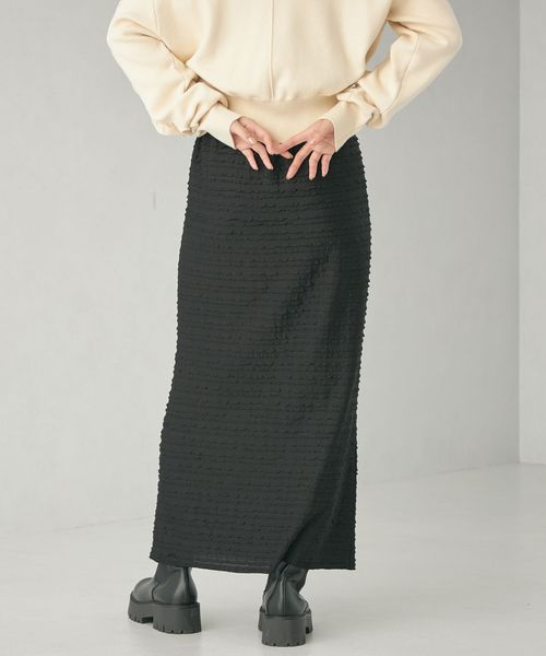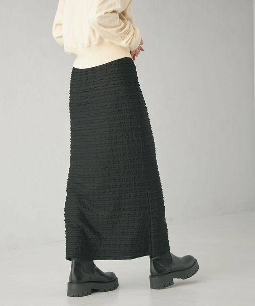 細幅のフリルが甘くなりすぎず、カジュアルなトップスともコーディネートしやすいロングスカート。