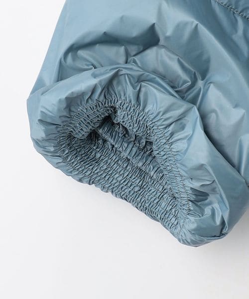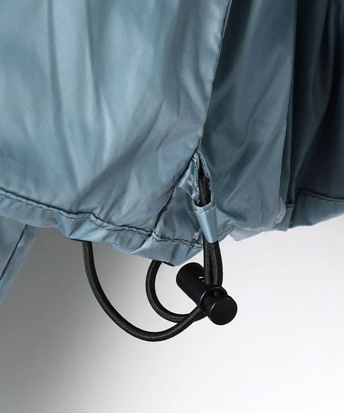 表地は美しい光沢をもつナイロン素材で、ロゴレタリングが施された衿元から伸びるドローコード、肩口から袖口にかけてゆったりと広がるテントラインの袖。