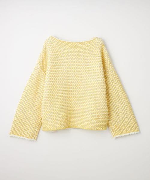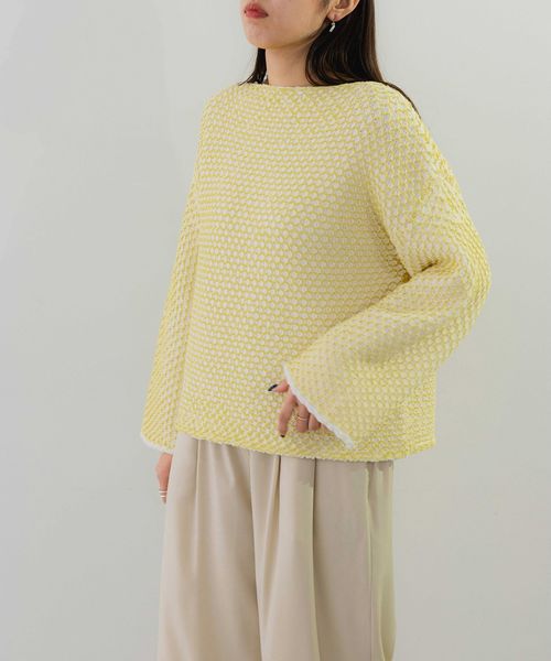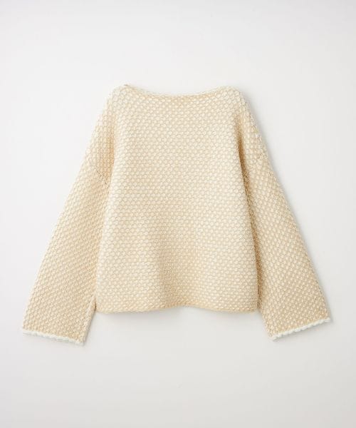 女性らしいボートネックとゆるっとした袖口、ボクシーなシルエットがフェミニンカジュアルなデザインです。