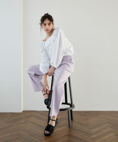 パンツに合わせれば足先から見えるギャザーデザインがスタイリングのワンポイントに。