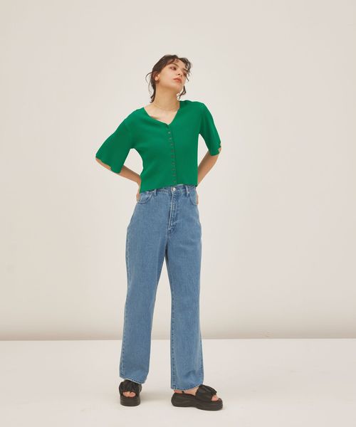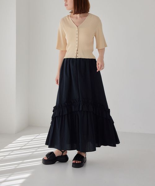 フロントに並んだ小粒なボタンが可愛らしいリブカーディガン。