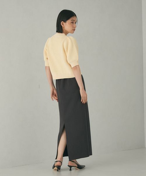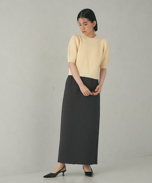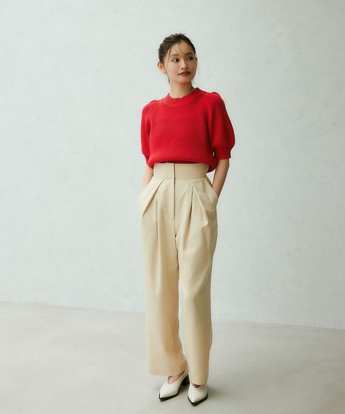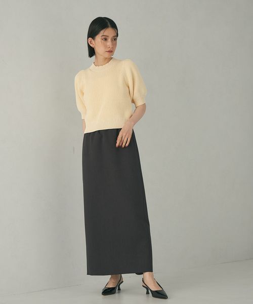 まだ暑い時期から取り入れやすいショートスリーブのニットで秋先取りのスタイリングに。