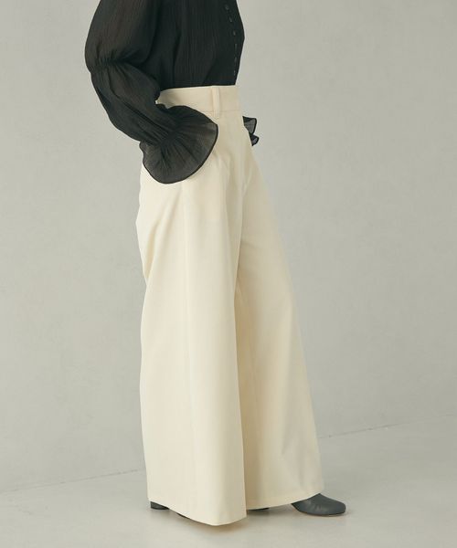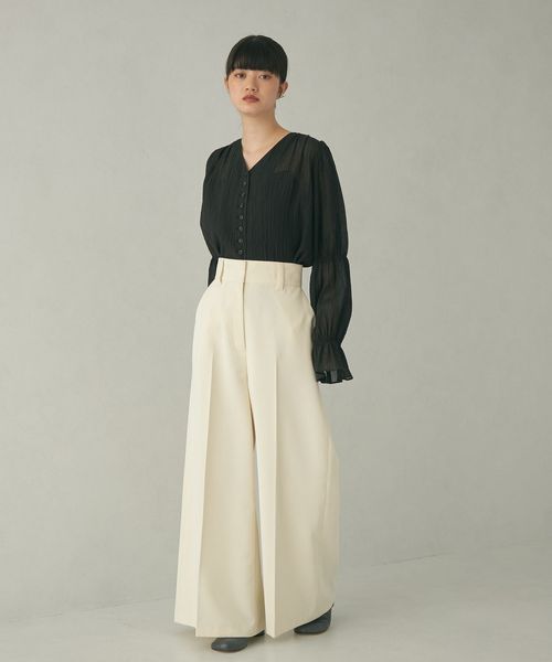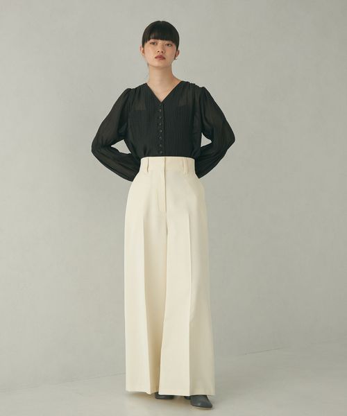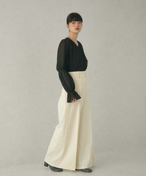 幅広いトップスと相性◎。まだ暑い時期にはシアー感のある軽やかなカットソーやブラウス、半袖のニットと合わせるのがおすすめ。