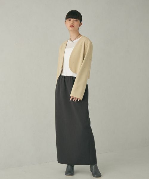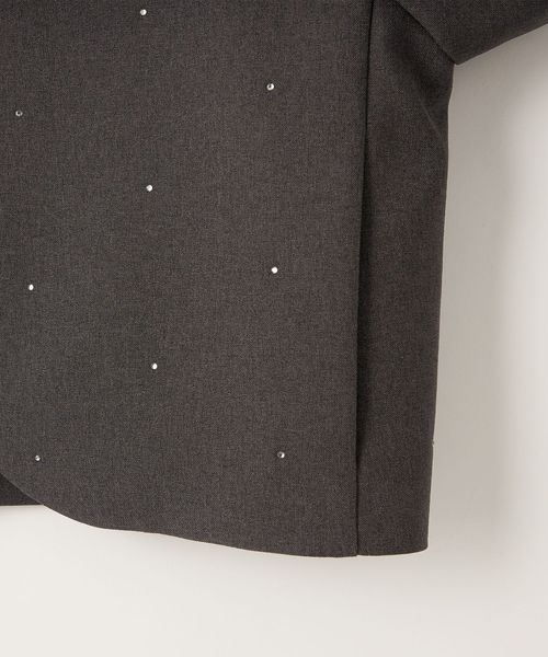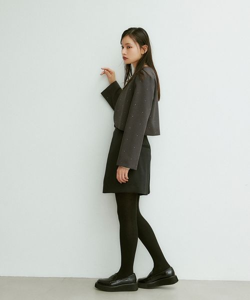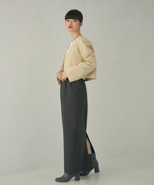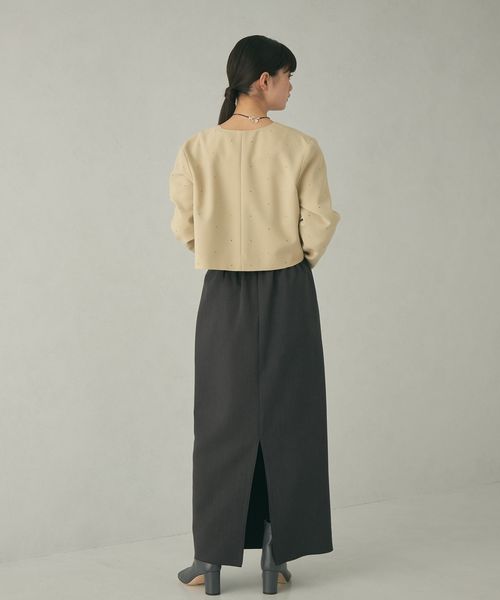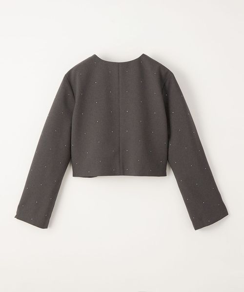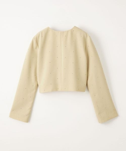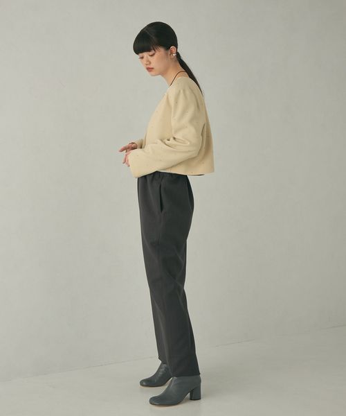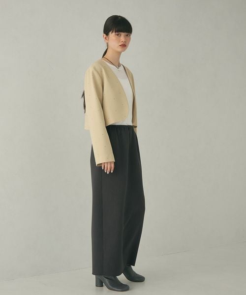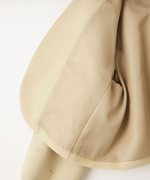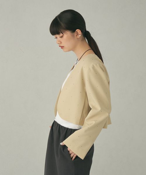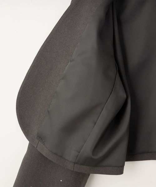ボレロ風のショート丈にボタンレスなさっと羽織れるジャケットで、堅い印象にならずカジュアルに着こなしていただけます。