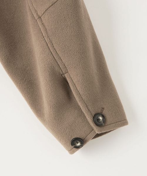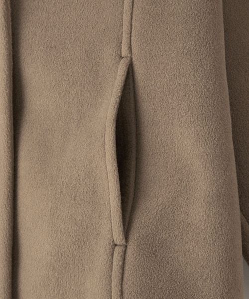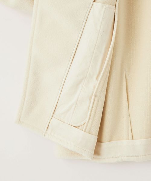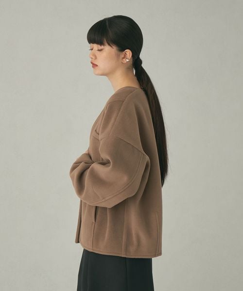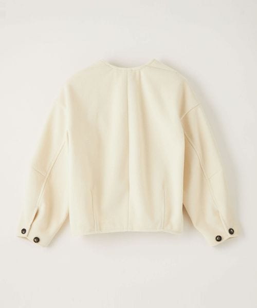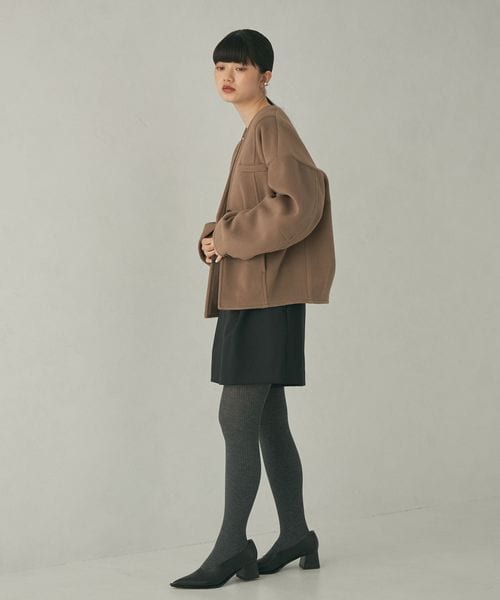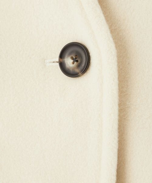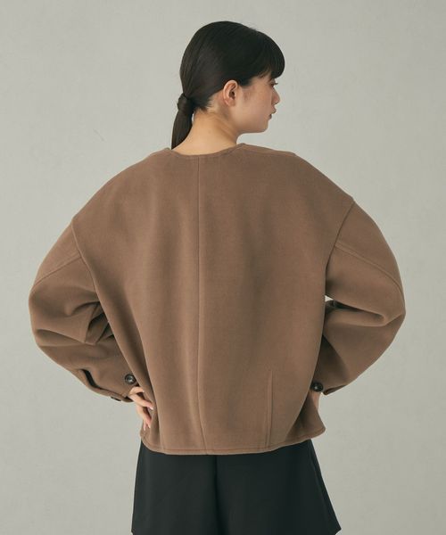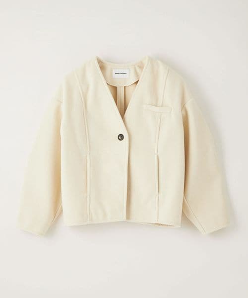 ショート丈のぽこっと丸みのあるフォルムに、ノーカラーのデザインでクリーンな印象で着ていただけるショートコート。