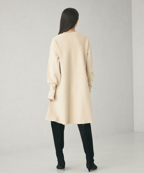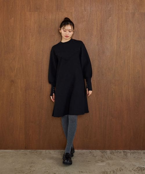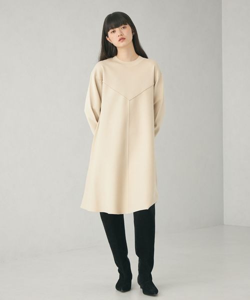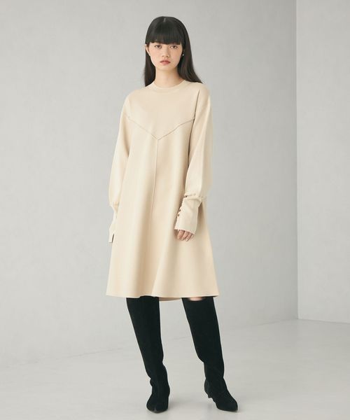 ハリのある素材のフレアシルエットでオンオフ兼用で着用いただけるワンピース。