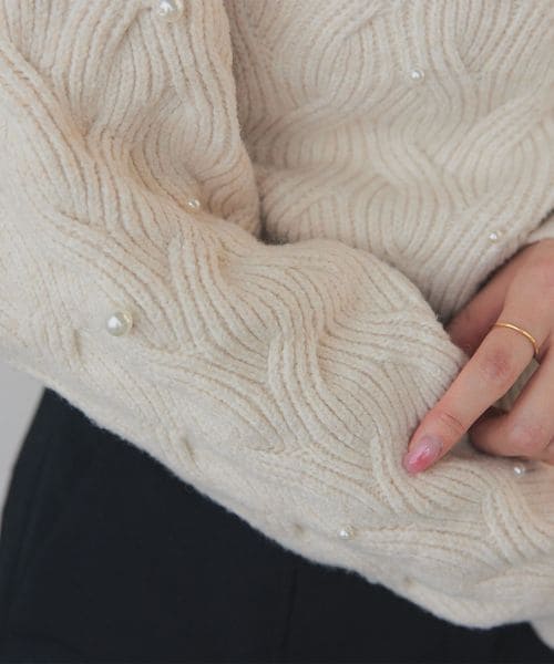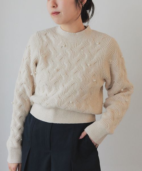 フェイクパール×ケーブル編みが大人かわいいニット
