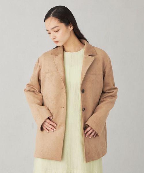 春の着こなしにさっと羽織るのに最適なスウェードライク素材のジャケット。