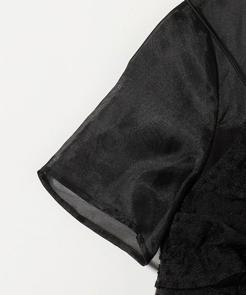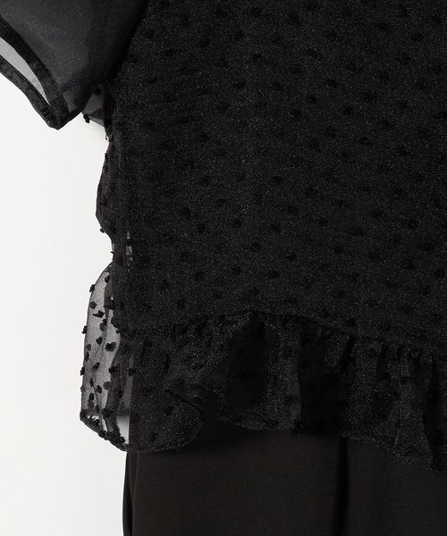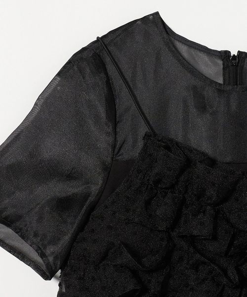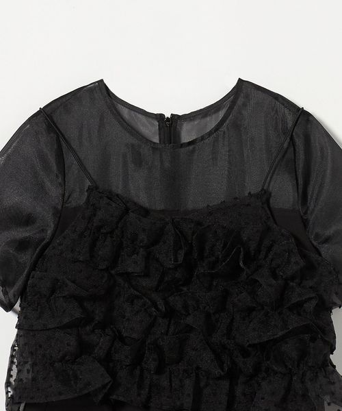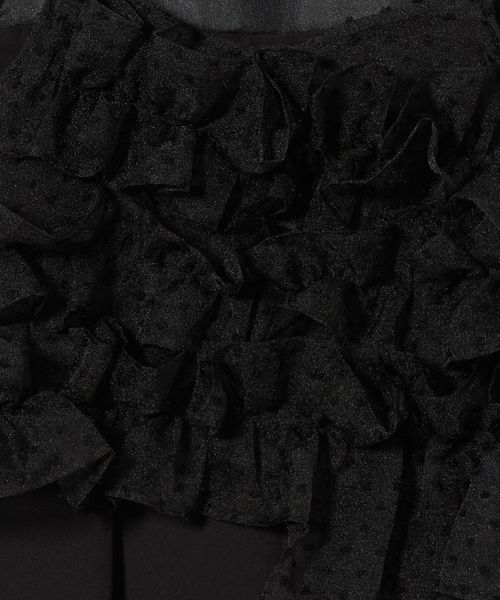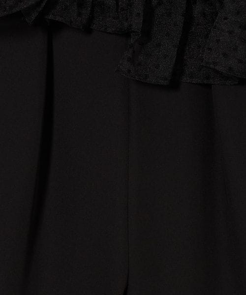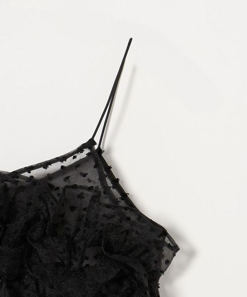 ドットオーガンジーの素材で立体的なフリルをアシンメトリーに施したキャミと、1枚でも着用可能なオールインワンは程よいゆとりの入ったストレートシルエット。