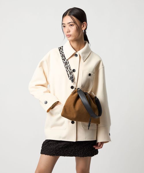 シックな印象のレザーライクのベルトと、長さ調節可能でクロスボディにもできるレオパード柄の2種類のショルダーストラップ付き。どちらも取り外し可能できれいめなスタイルからレジャーシーンまで様々なスタイルが楽しめます。