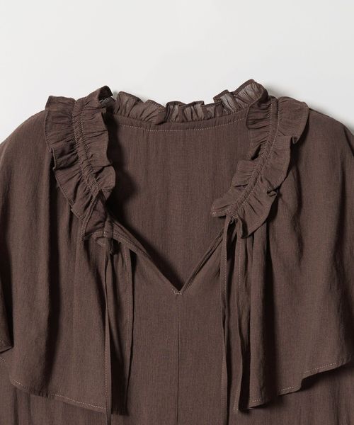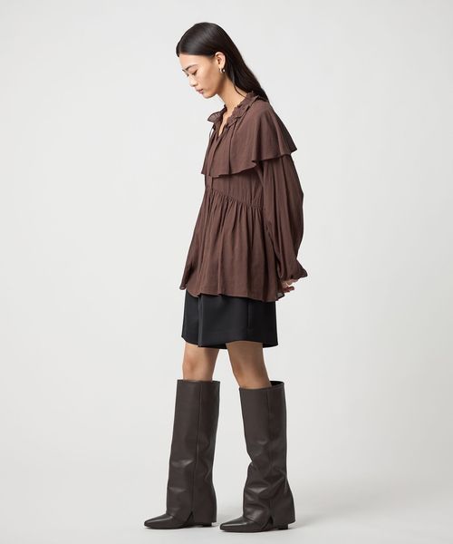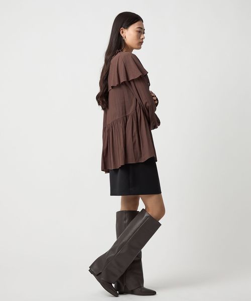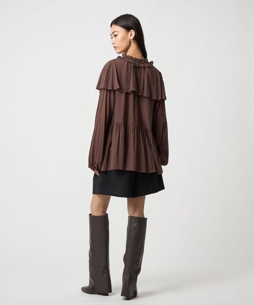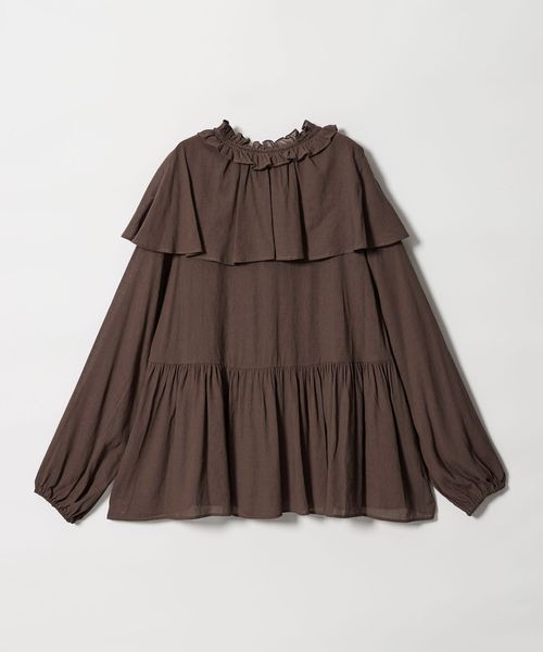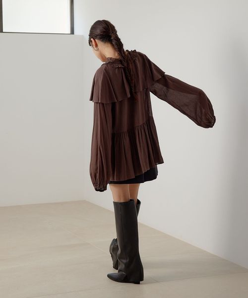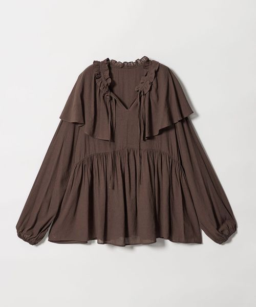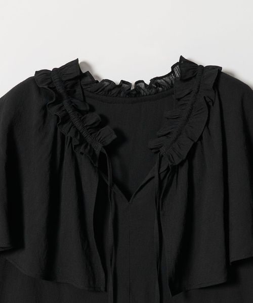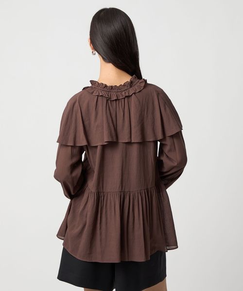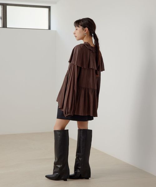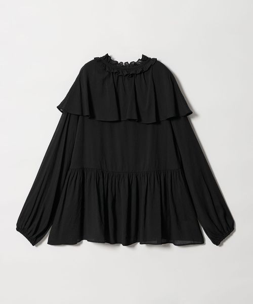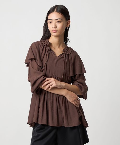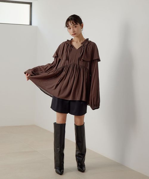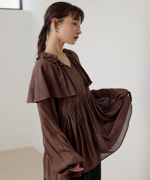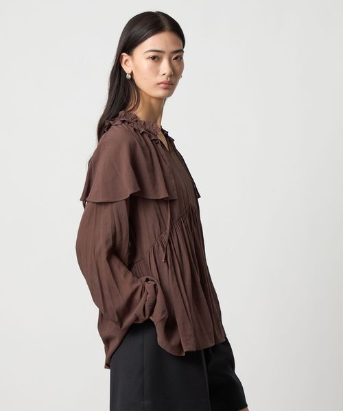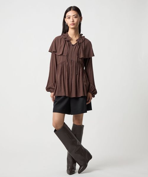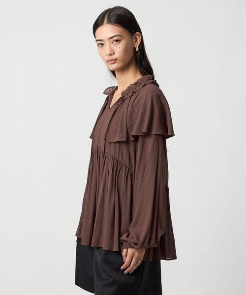 ケープのようなネックフリルデザインが目をひくブラウス。