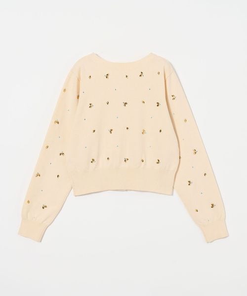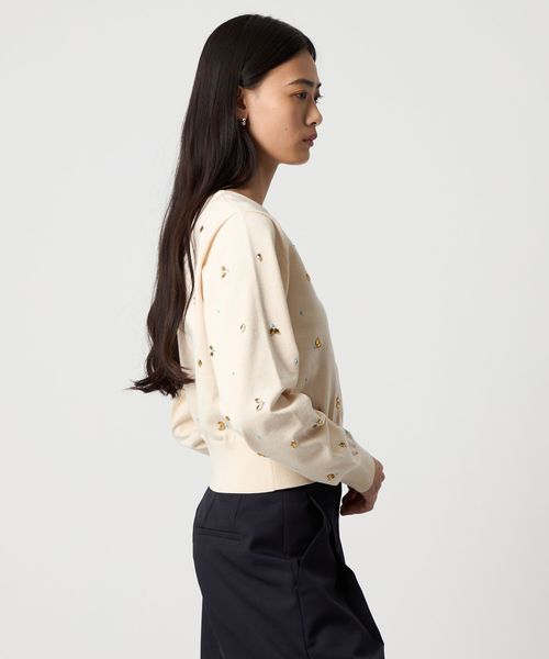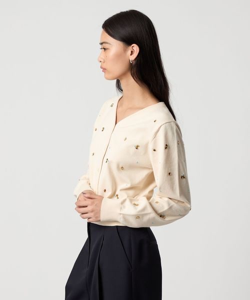 ビジューが全面にあしらわれた華やかなデザインで、モードなムードも漂う着映えトップス。