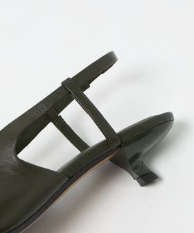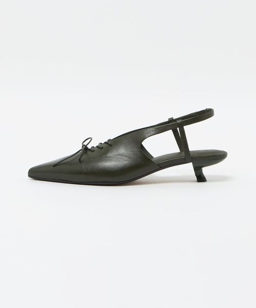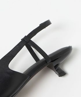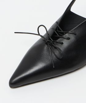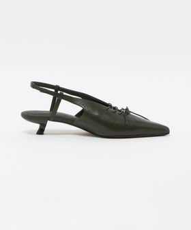 Vカットとレースアップディティールを組み合わせたバックストラップパンプス。