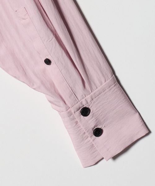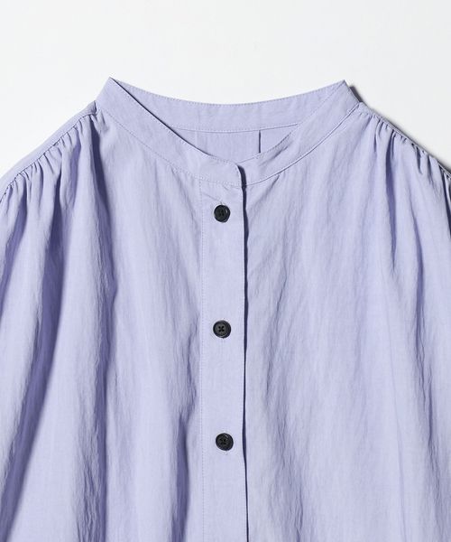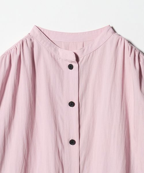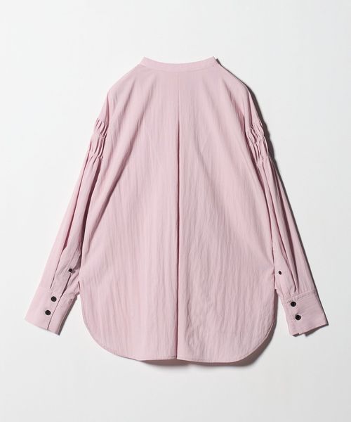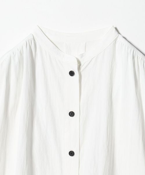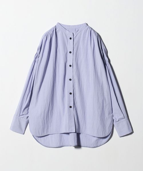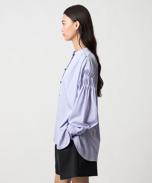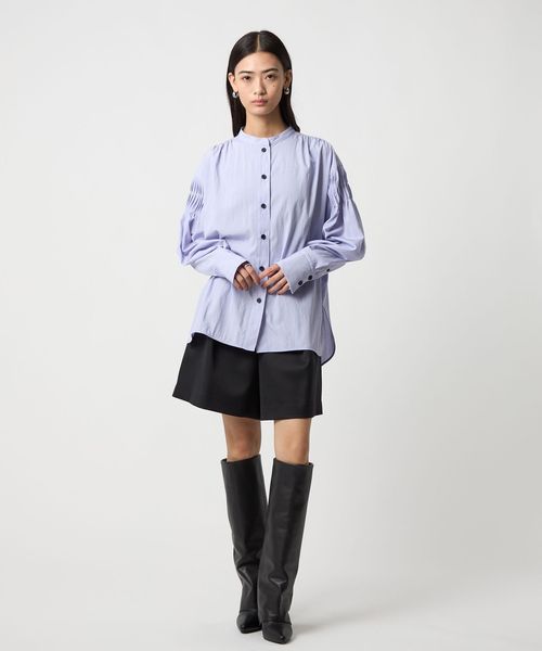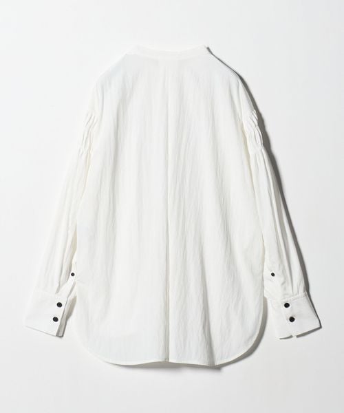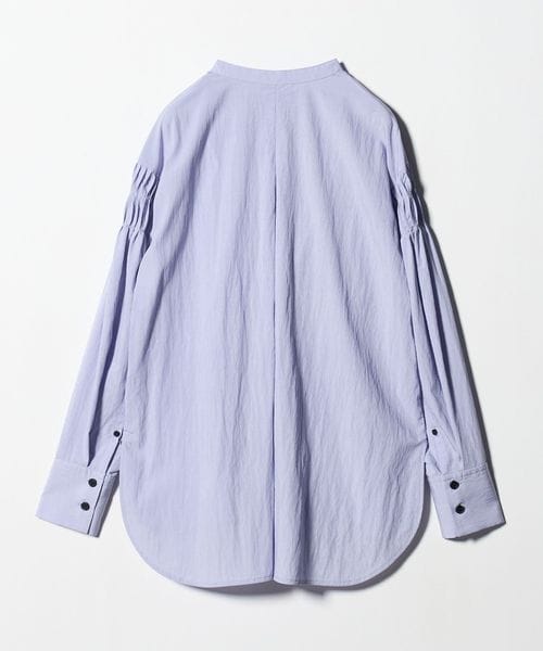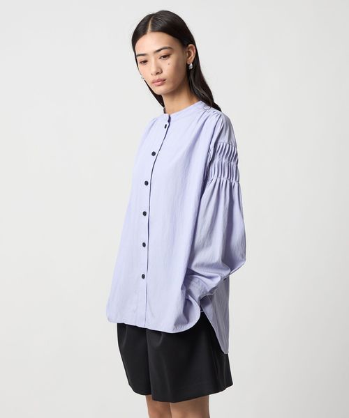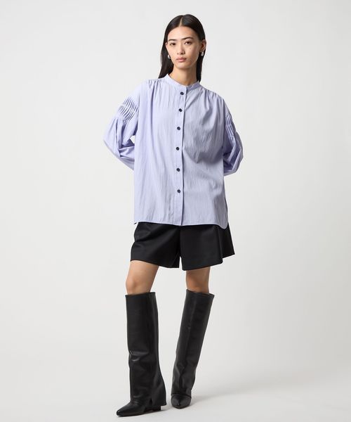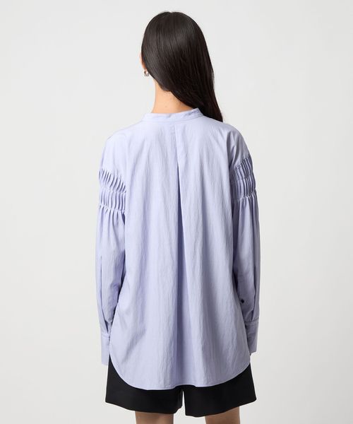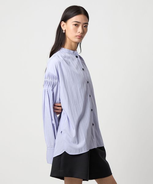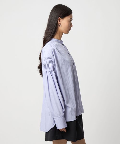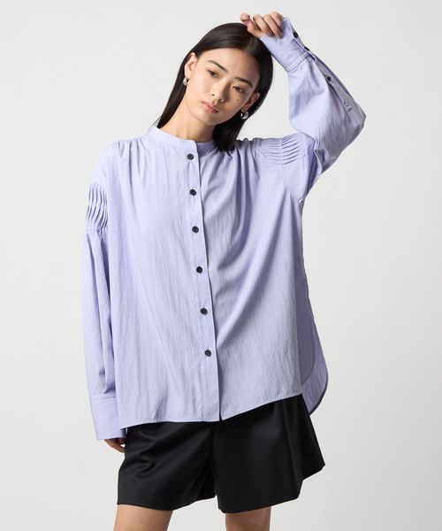 袖のタックディテールがポイントのスタンドカラーシャツ。