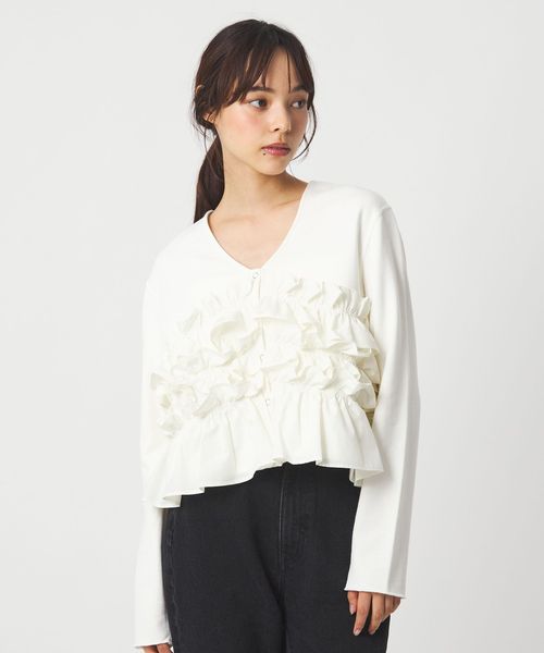前後2WAYで着用できる大胆なフリルがポイントのカーディガン。