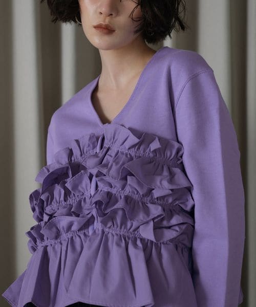 カジュアルな裏毛を使用し、あえてフリルも大きく付ける事で抜け感のあるフェミニンな仕上がりに。
