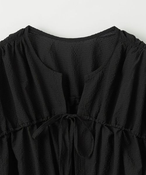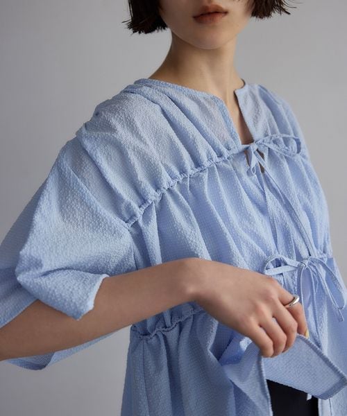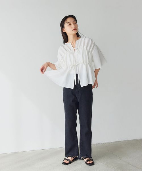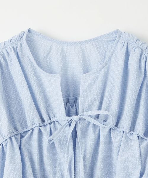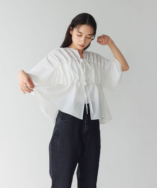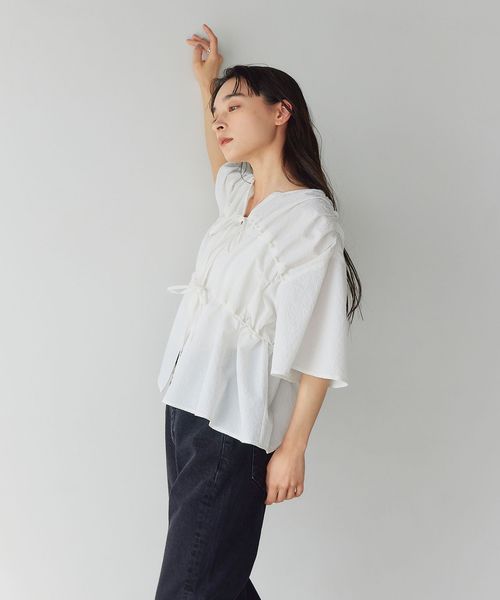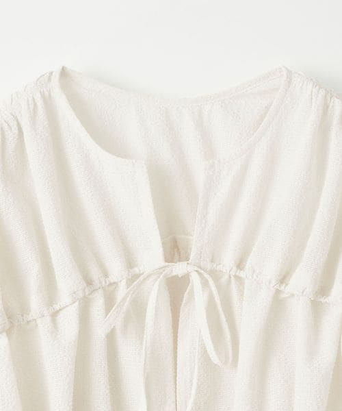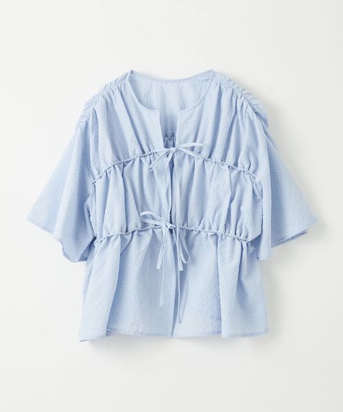フロントのリボンとたっぷりのギャザーがポイントのブラウス。