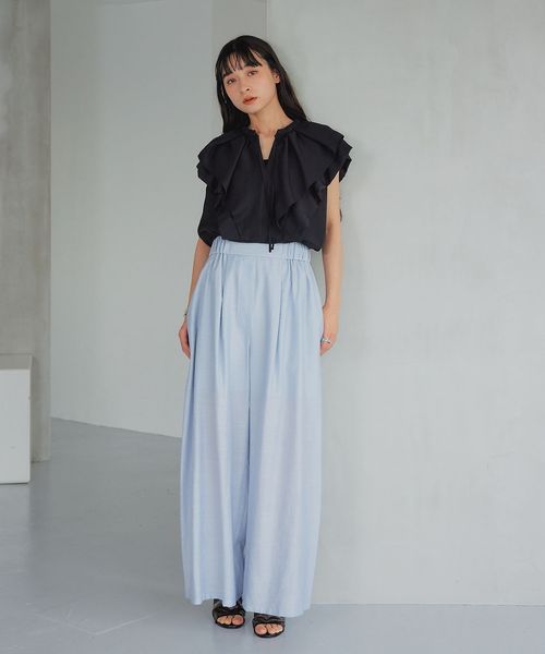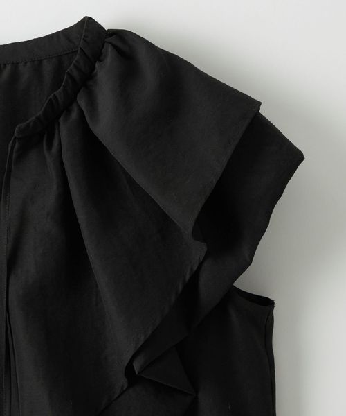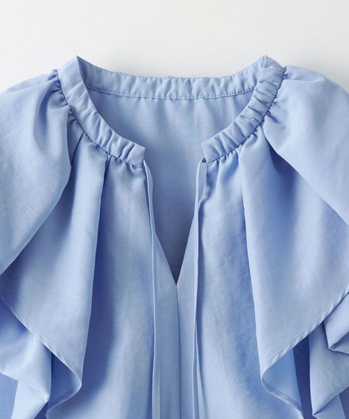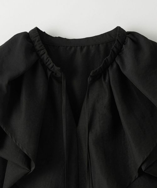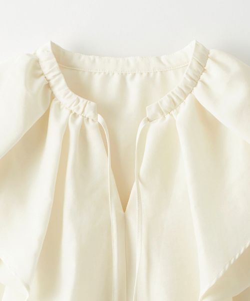 ネックのギャザー感やフリルのようなケープデザインがフェミニンな印象に。